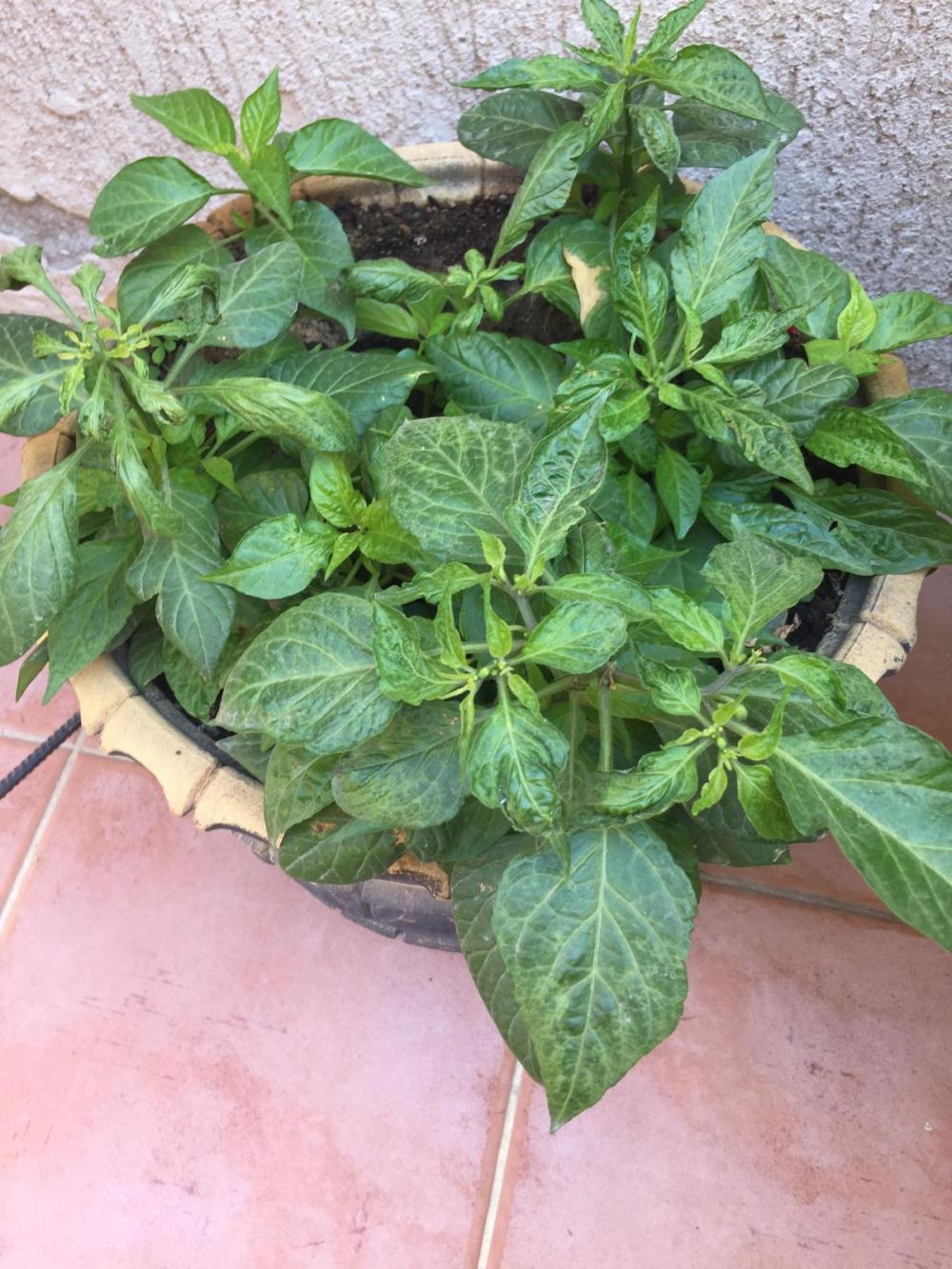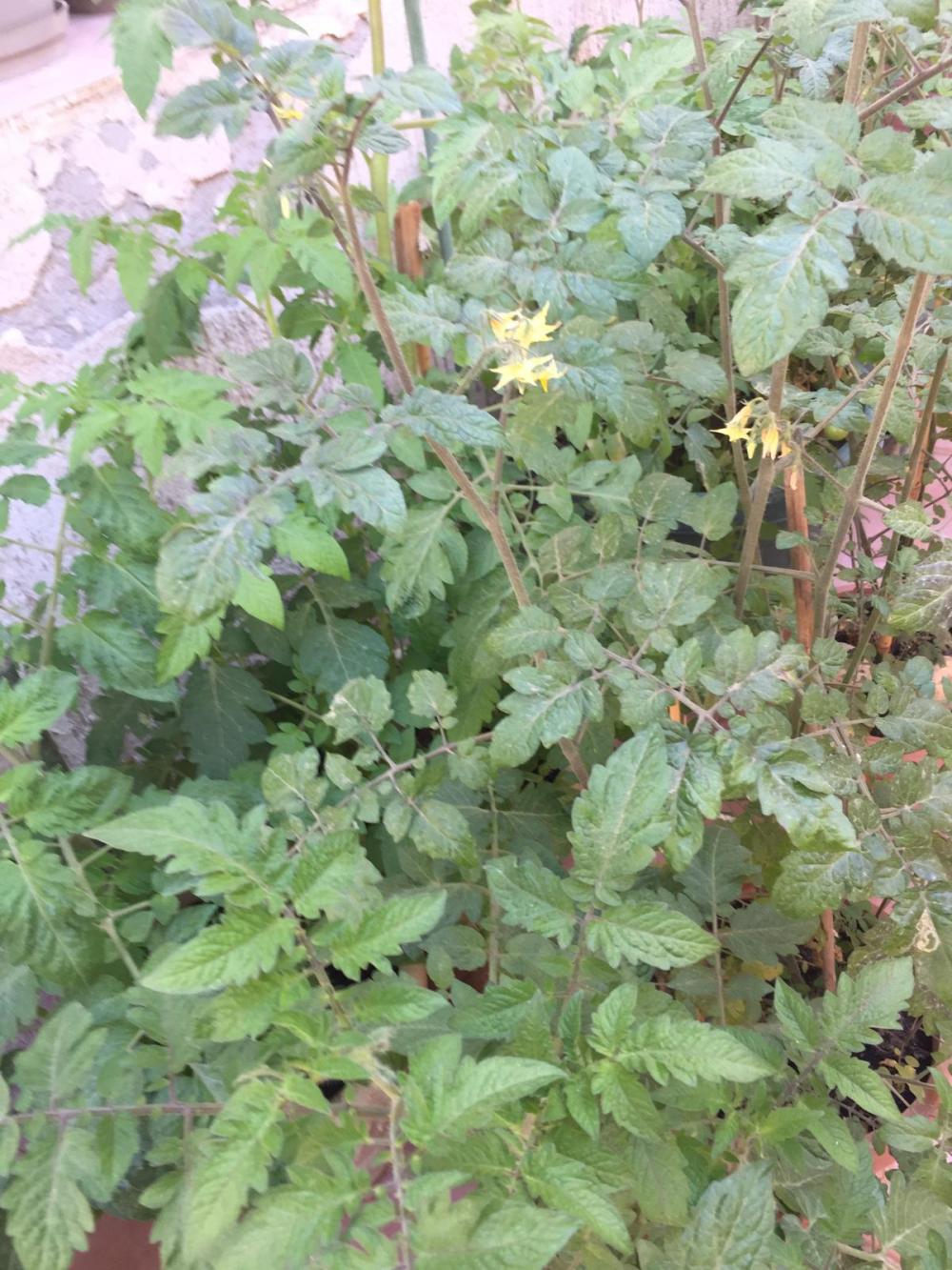 نبات الطماطم تزاحم في الأصص ولم يزل زهره الأصفر قليل..