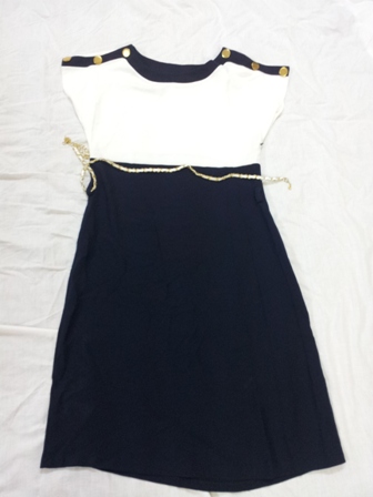 فستان راقي باللبس صناعة تركية جديد لم يستخدم قماشه ثقيل قريب للكريب مقاس 44 جديد يجي لنص الساق لونه اوف وايت وكحلي
