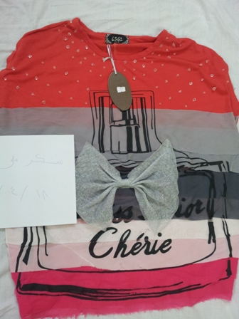 يجي معاها الحزام الوردي الساتان وانا طقمت لها بنطلون وردي استرتش مقاس 28 الي تاخذ البلوزة هدية البنطلون معاها