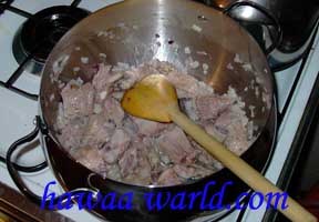 نحمر اللحمة ثم نضيف حوالي كوب ونصف من البصل ..