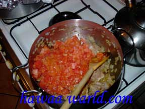 نضيف البهارات دفعة واحدة ونحرك جيدا حتى تمتزج مع اللحمة ثم نضيف الطماطم