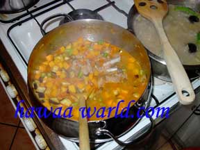 نضيف الخضار المقطعة .. يلاحظ ان الخضار المستخدمة من النوع اللي ينضج بسرعة لذلك يجب ان تكون اضافتها في اخر ست دقائق إلى عشر دقائق ( انا طبختها خمس دقائق ثم اغلق النار وتركته في القدر حار وواصل الطبخ )