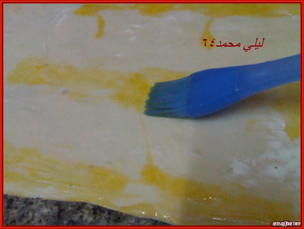 نفرد العجينة علي سطح مرشوش دقيق ونخليها رقيقة ونعمل بفرشة مدهونةبيض فواصل مربعات