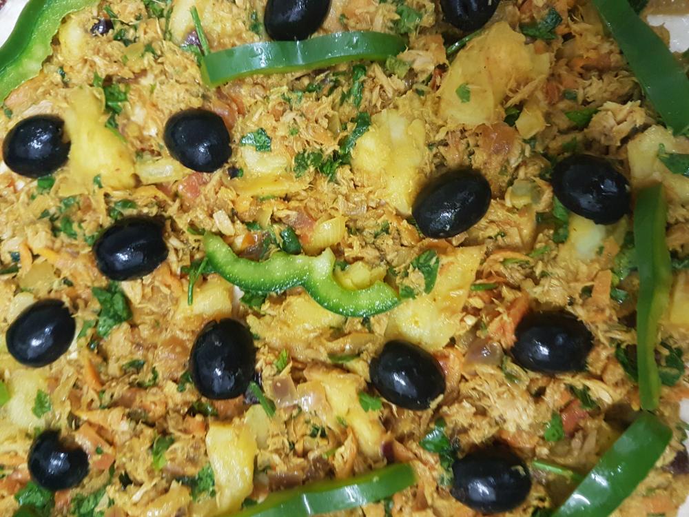 بعدها نكون قد جهزنا الكشنه من قبل وتكون بارده اللي هيه قطعت بصل وحمرته لين ذبل وحطيت طماطم مقطعه صغار وحطيت البهارات والكركم وخليتها لين تذبل بعدها حطيت الجزر المبشور وطفيت النار وحطيت التونه بعد ماصفيتها من الزيت وقلبتها مع الكشنه والبطاطس سلقته في مويه ٣ دقايق بعدها حمرته في الفرن مع زيت زيتون كأني بسوي بطاطس عادي وطلعته قطعته وحطيته مع التونه ورشة بقدونس أخضر وخلاص بكذا جاهزه شوفوا شكلها...