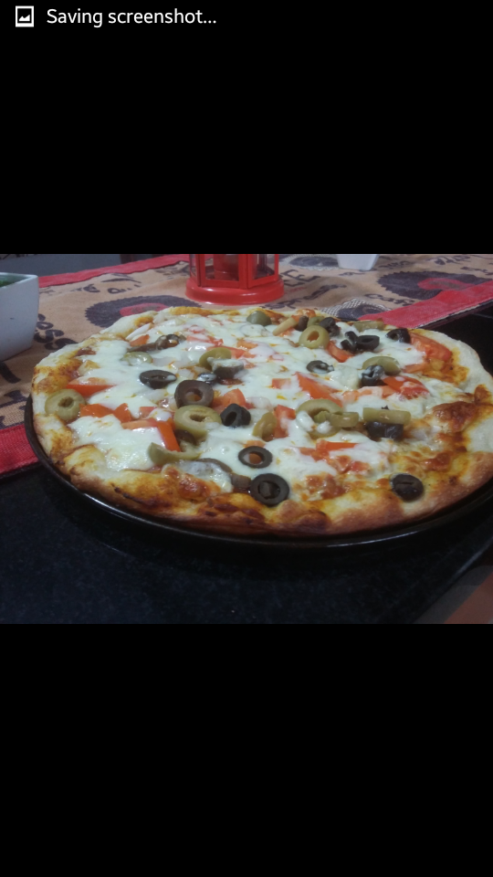 تفرد العجينة و تدهن بالصلصة و يوضع الحشو حسب الرغبة ... أنا حطيت زيتون أخضر و اسود و بصل مكعبات طماطم مكعبات و سر الطعم الرهيييب هو مكعبات زبدة توضع بعد وضع جبن الموتزاريلا ...تخبز في فرن عالي الحرارة