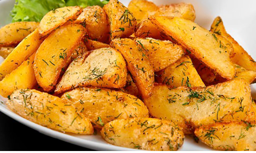 ونجيب بطاطس صغيره نغسلها ونقشرها ونقطعها اصابع وسط لا سميكه ولا رفيعه ونتبلها ونشيف لها زيت ونشويها بالبفرن