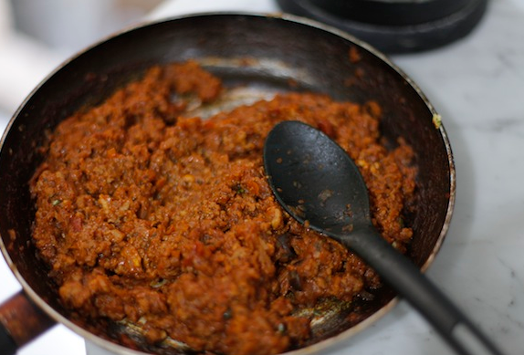 النوع الثاني : اما دجاج مفروم او لحم مفروم نحمس في التاوة بصل بعدين نضيف له عصير طماطم ونتركه الين ينطبخ شوي ثم نضيف اللحم او الدجاج ونتركه الين تنشف مويته تماما ونضيف له التوابل اللي نحب