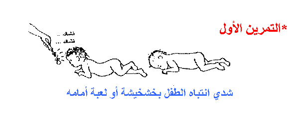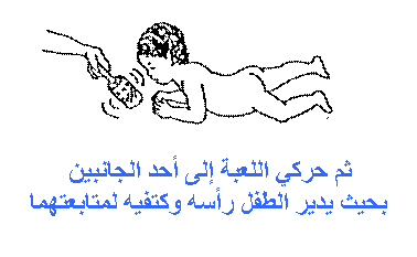 لتشجيع الطفل على رفع رأسه عندما يكون منبطحاً على وجهه . يمكن جذب انتباهه بأشياء ذات ألوان فاقعة تصدر عنها أصوات غريبة وجذابة