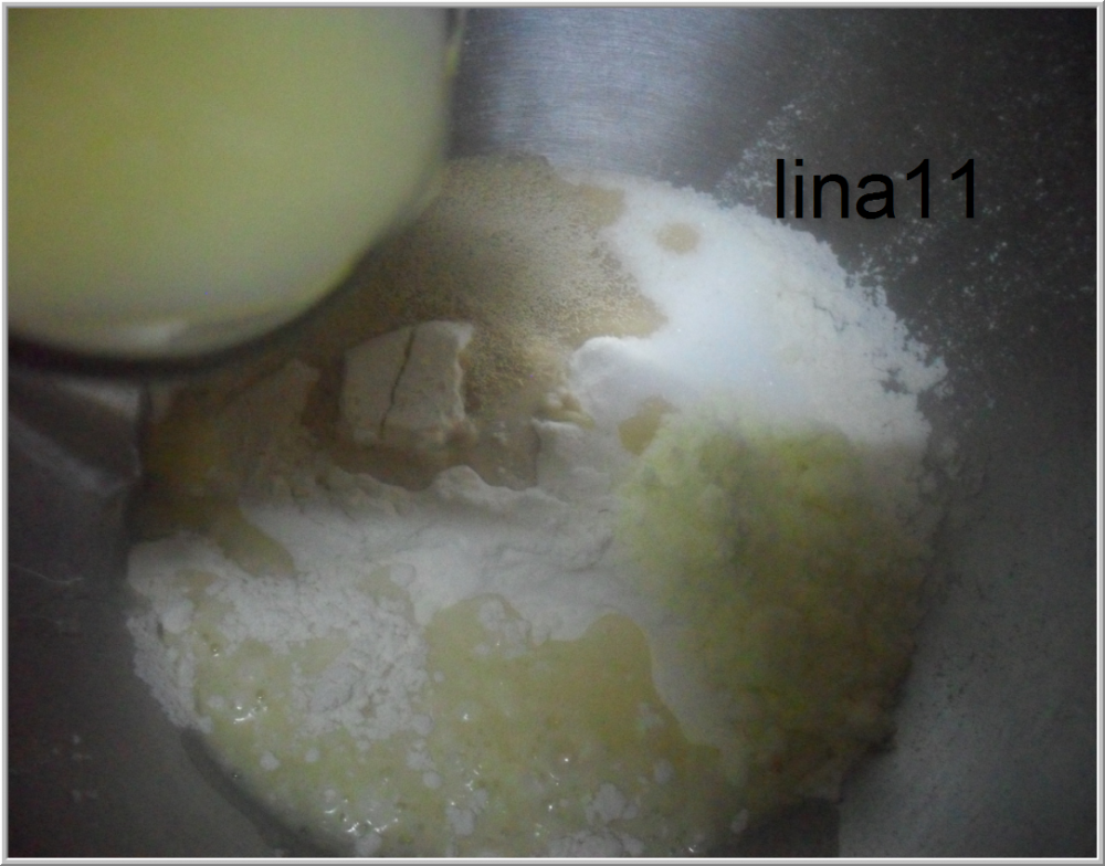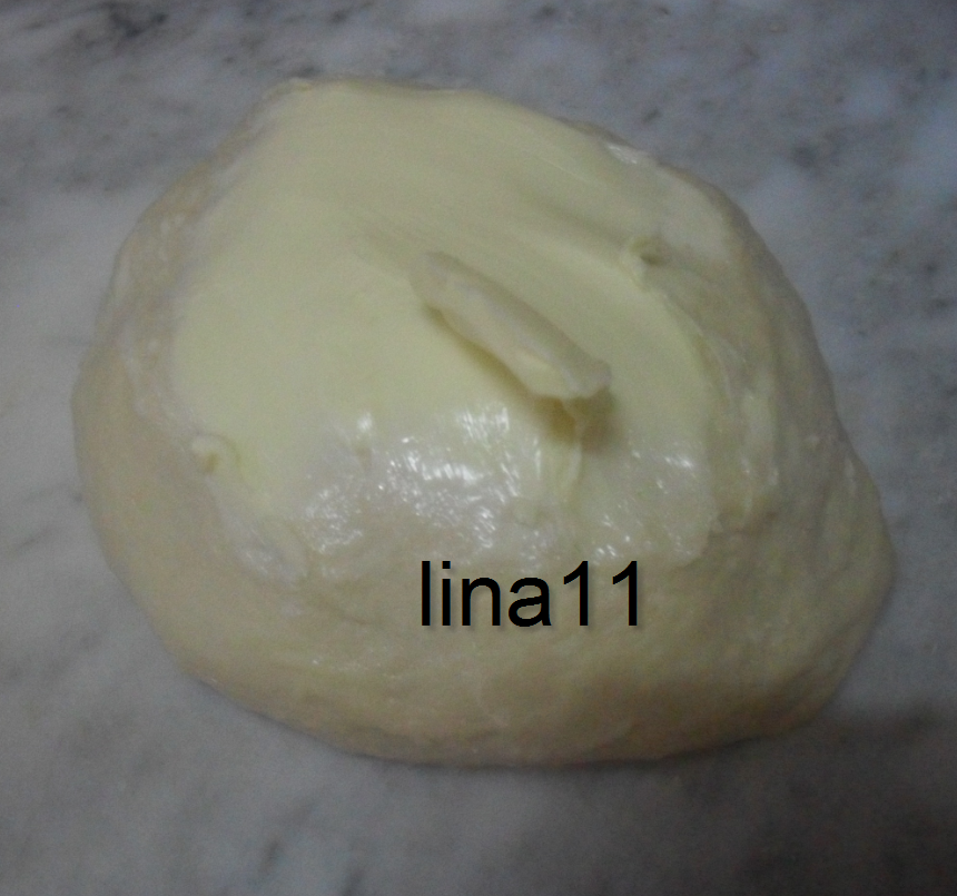 نخلط جميع المقادير جيدا حتى نتحصل على عجينة ونضع زبدة طرية فوقها ونتركها تخمر ثم ندخل فيها الزبدة جيدا بعجنها