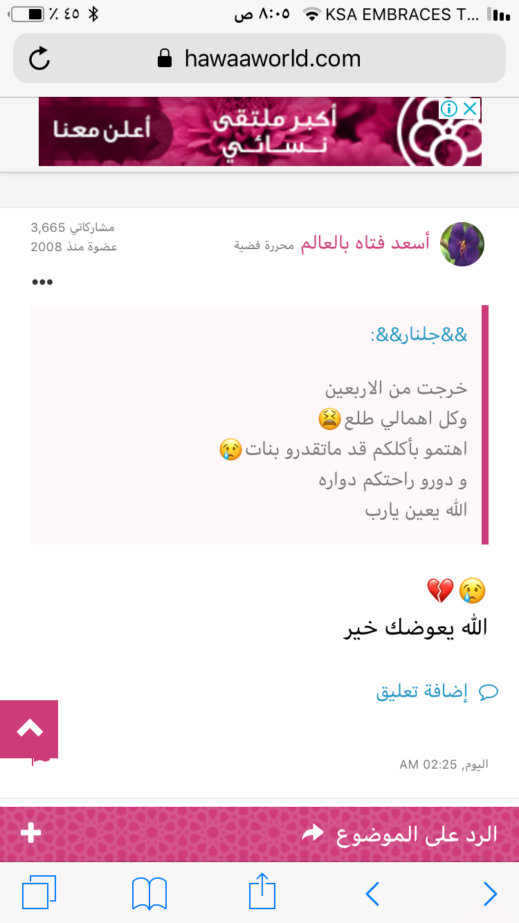 كل عام وانتم بخير وعادت اعيادكم يارب طبعا اوول عيد رحت لااهلي من الفجر وزوجي راح لااهله عشان يذبحوون الضحايا وبعد الظهر رجعت بيتي هلكانه نووم وقطعنا ضحيتنا ونمنا الى العشاء وقمنا ورحنا نعيد على اهل زوجي وتعشينا عندهم وامس جتني اختي من العصر وجلست الى نص الليل وانبسطنا كانت الخطه اهلي كلهم يجوون بس جتهم عمتي من منطقه ثانيه وجلسوو بس ارهاق وقل نووم ونونو وركض بس الحمدلله ربي يسرهاكل عام وانتم بخير وعادت اعيادكم يارب طبعا اوول عيد رحت لااهلي من الفجر وزوجي راح لااهله عشان...