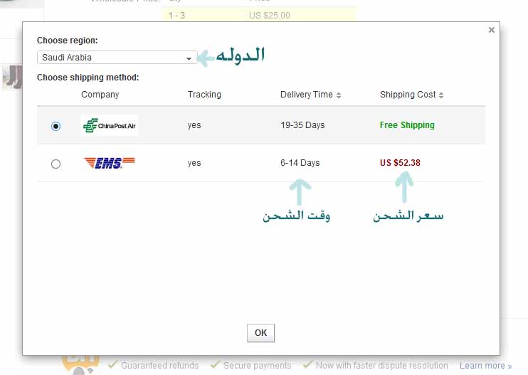 اخترت الشحن عن طريق البريد الصيني وهو مجاني كما هو موضح