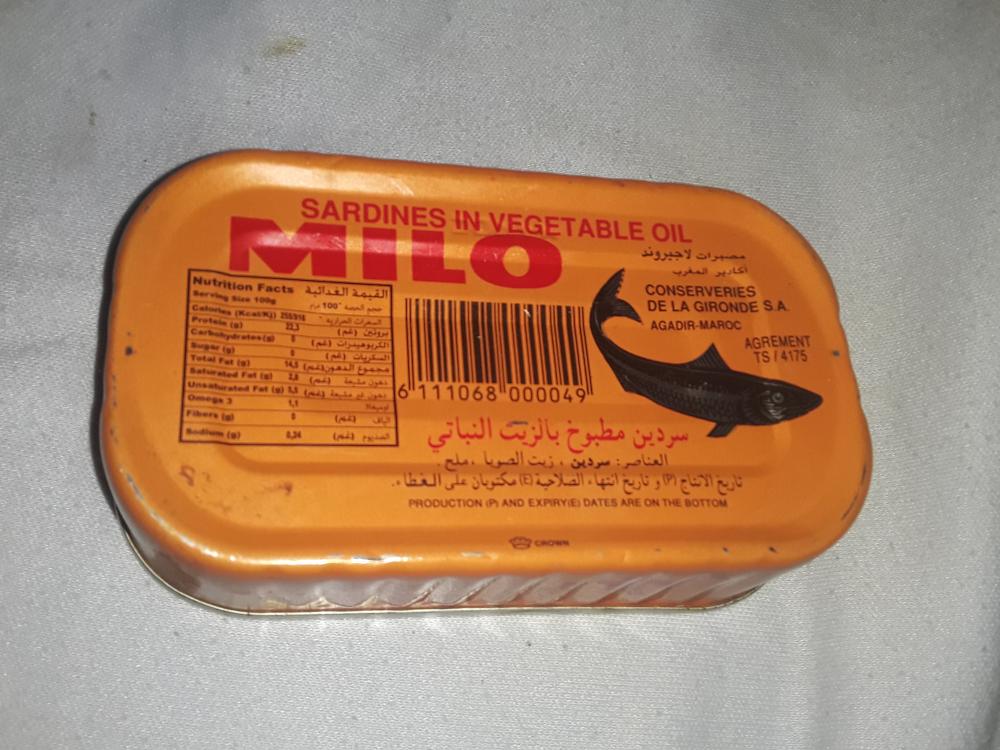 امبارح اولادي تعشو هاي العلبة اسمها سردين جواتها سمك صغير تقريبا ٤ سمكات اعطتني اياها قبل ٥ شهور جمعية خيرية