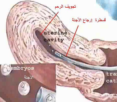 -يستخدم منظار المهبل لرؤية عنق الرحم حيث يتم وضع 1-2 جنين فى قسطرة خاصة ويتم إرجاعها الى الرحم