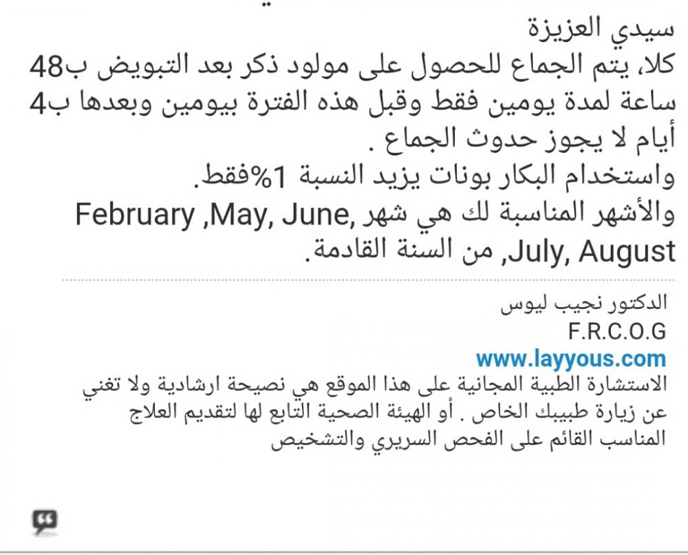 والجماع بعد نزول البويضة بإذن الله ذكر الا اذا كان الزوج عنده مشاكل منها اللزوجة او قل الحركة
