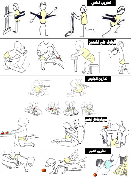 إن ممارسة هذه التمارين بصفة تدريجية ومتكررة خلال اليوم تساعد الأطفال ممن يجدون صعوبة في التحكم في الرأس أوالجلوس أوالوقوف الى الوصول للتمكن من هذه المهارات. وسنستعرض هنا بعض التمارين عامة التي قد لا يستطيع الطفل القيام بها كاملة بحسب شدة الإصابة أولوجود إعاقات كالعمى والصمم والتخلف العقلي الشديد. ولكن لا يمنع ذلك من الاستمرار في محاولة تأدية هذه التمارين. ويشجع الوالدان إلى إضفاء جو من المرح لهذه التمارين بالتحدث واللعب والضحك مع الطفل.