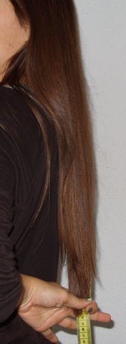 ثالثا امسكي بيدك الشعر و الشريط معا (و احرصي انه الشعر يكون "سيده" يعني ممشط من قبل) حتى تصلي لطرف الشعر. في النقطة إلي ينسحب عندها الشعر و تبقى يدك ممسكه بشريط القياس.. في هالنقطة وقفي و اقري النتيجة .. مثل هالصورة