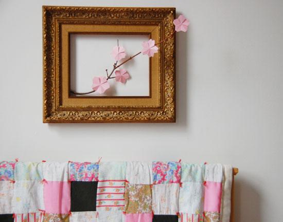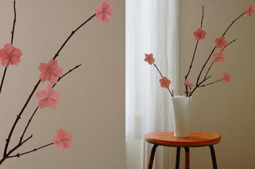 ترتيب لك فروع خاصه في إناء أو الإطار ، إرفاق إزهار الكرز مطوية على الفروع باستخدام الشريط.
