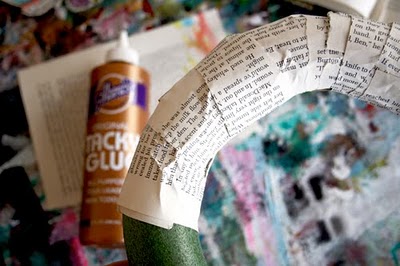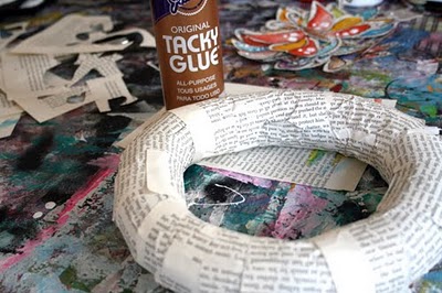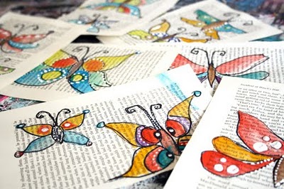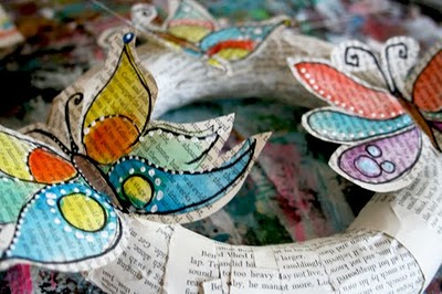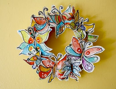 اكليلا من الزهور المصنوعة من صفحات الكتب اواوراق الدفاتر وغيرهاالمعاد تدويرها التي تم تحويلها إلى الفراشات