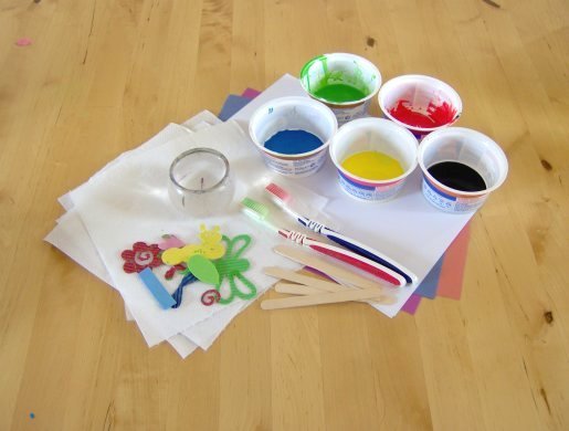 Paints, paint pots(yoghurt pots) and brushesالوان وفراشي + علب زبادي لتوزيع الالوان