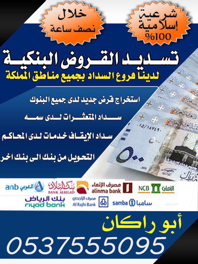 لمن يريد بسداد قرض القديم و استخراج قرض جديد في وقت قياسي لعملاء جميع البنوك و تسديد المتعثرات في قائمة سم وتحويل من بنك الى بنك آخر بطريقه شرعيه اسلامية (تسديد قروض بنكية و المتعثرات وعطى اعلى تمويل و اقل نسبه