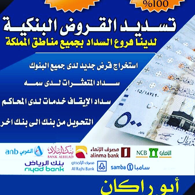 لمن يريد سداد القرض القديم واستخراج قرض جديد في وقت قياسي لعملاء جميع البنوك وتسديد التعثرات في قائمة سمه وتحويل من بنك الى اخر وتسديد المطلابات الماليه التي تعيق نزول القرض في المحكمه وفك الحجز عن الحساب بعد السداد