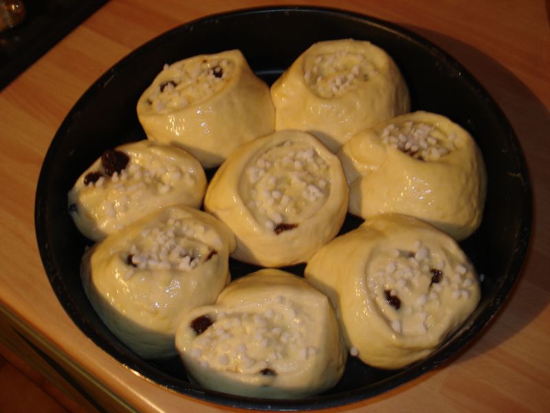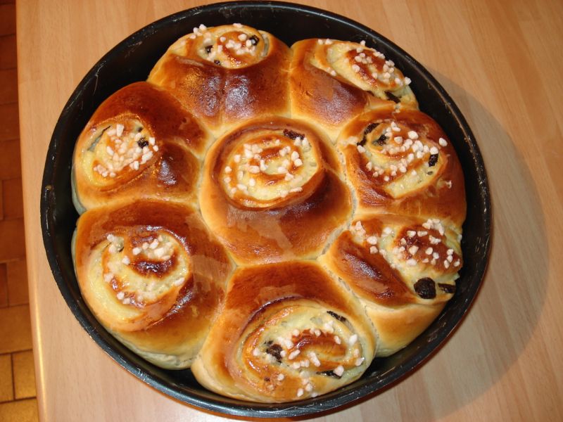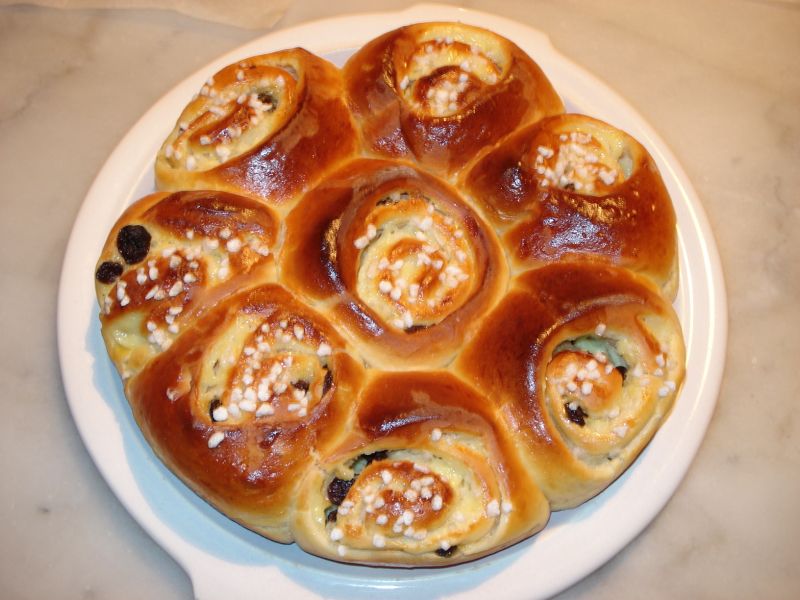 نفس عجينة بريوش و لكن مبسطة على طاولة و نضيف عليهااا كريمة الكتسرد و حبات شكولاه و نلفهااااا و نقطعها و نعملها هيك ف صينية مدهونة و تترك تتخمر ساعة بعدين تخبز و سكر خاص بالحلويات لتزيين