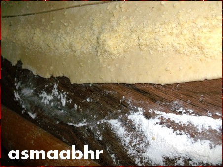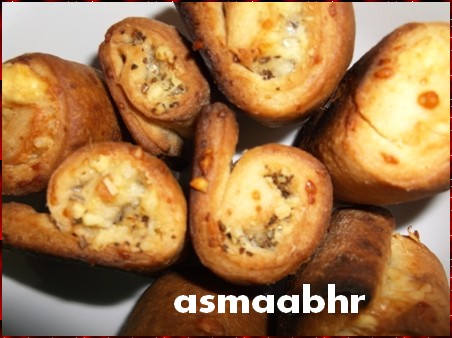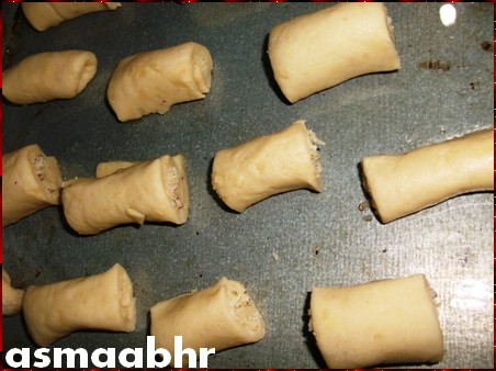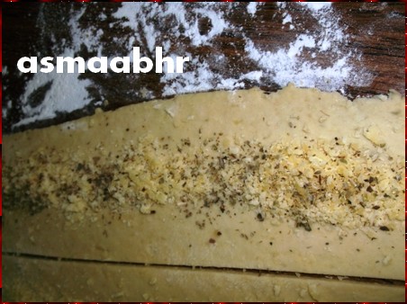 **نأخد جزء من العجينة ويشكل علي هيئة اسطوانة ثم نفرده باليد قليلا ونضع الجبن ونلف العجينة حول الجبن وتقطع وتوضع في الفرن