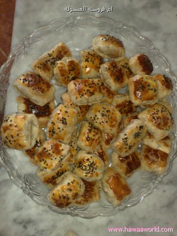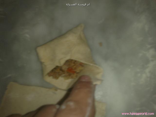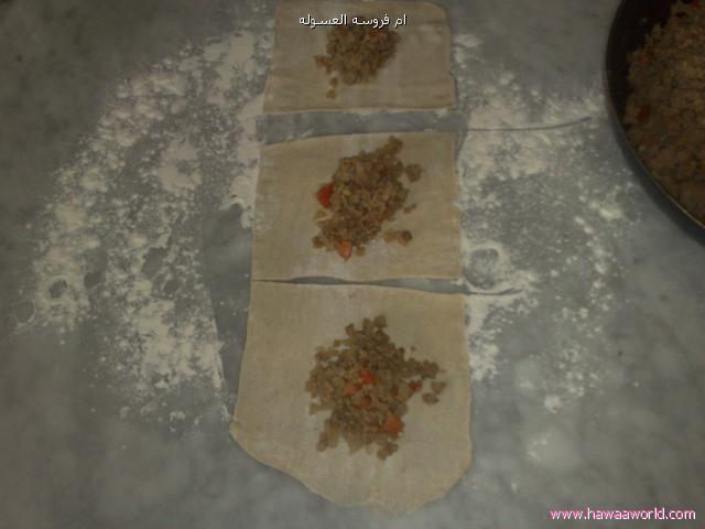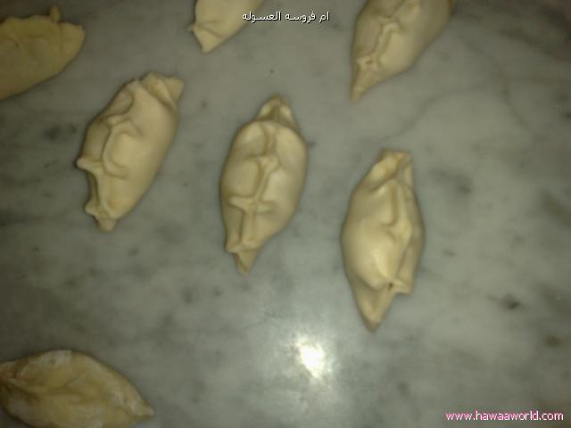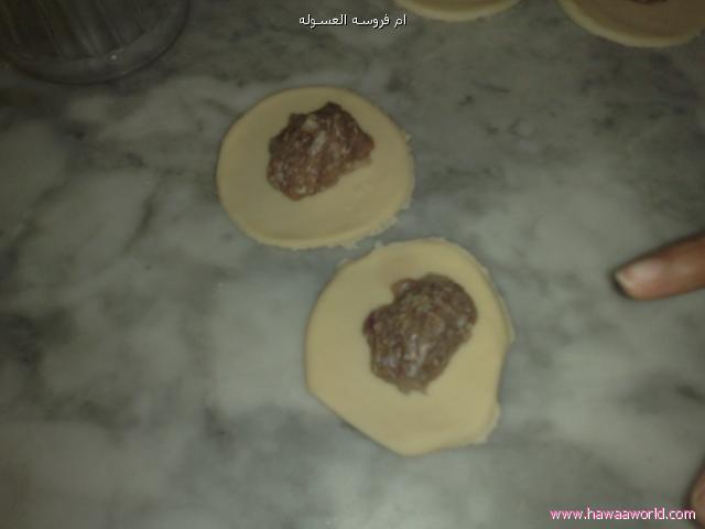 نبدء فرد العجين ثم نقطعها دوائر بالكوب ونحط الحشوه ونبداء نظفرها ونرصها في الشبك ونخلي بينها مسافه وتترك ربع ساعه على النار