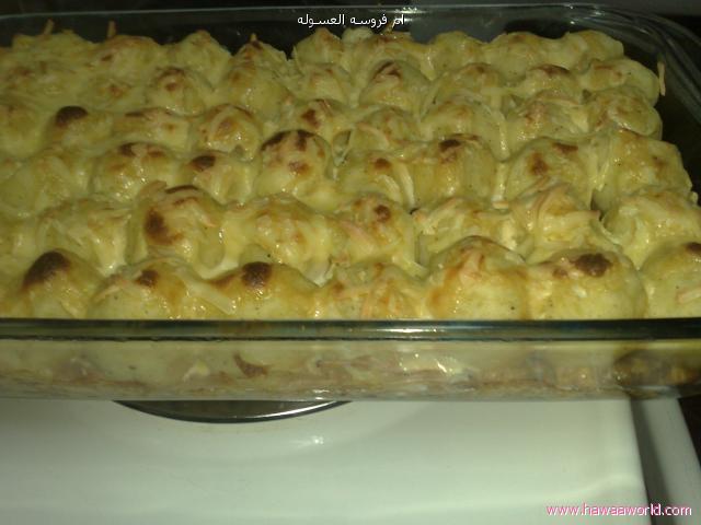 ندهن الصينيه بالزبده ونرشها دقيق ونصب نصف الخلطه ثم نضع الحشوه ونوزعها بالتدريج وبعدها نصب باقي الخلطه وتدخل الفرن نصف ساعه