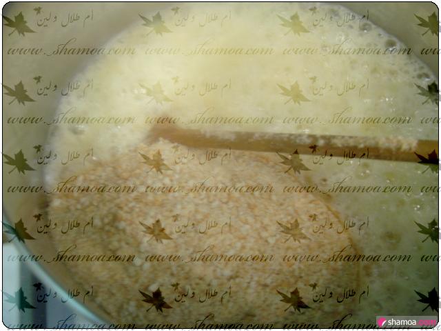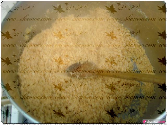 ولما تذوب الزبده نضيف البسكويت المطحون ونقلبه الى ان يتحمص شويه