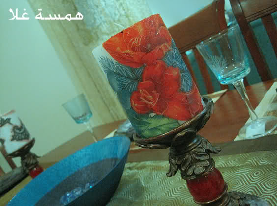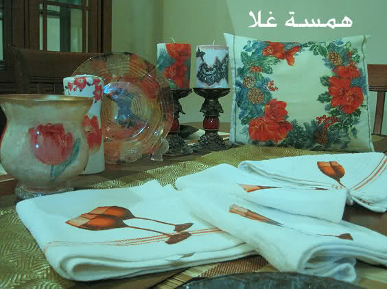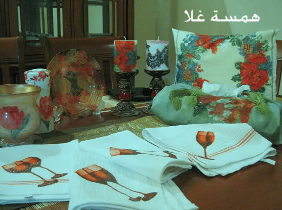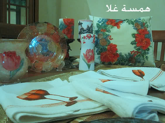 وهذي اعمالي مجتمعه وهي عبارة عن تلبيسة مناديل وخداديه وصحن وفازة وشموع ومناشف
