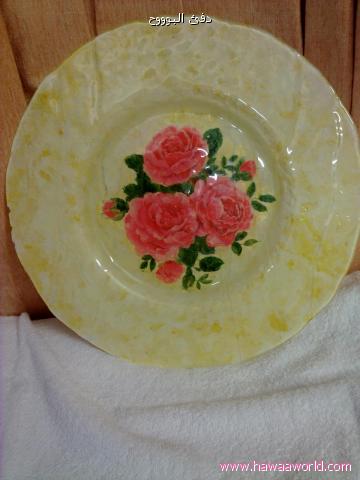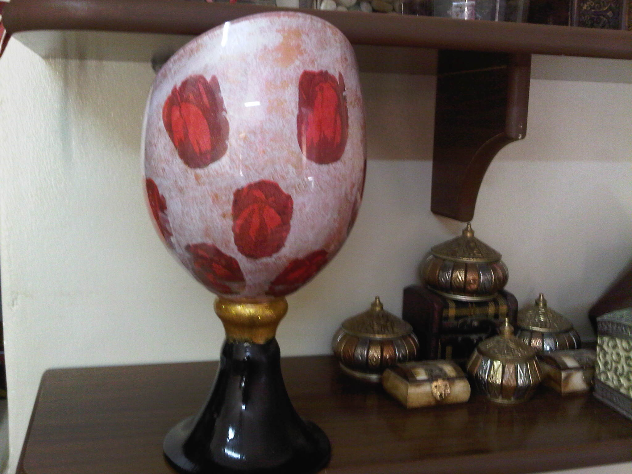 وهذا تطبيقي للمرحلة الثانية (الزجاج)بالفرشاة على فازة شفافة عندي سويت القاعدة من برا بلأسود والحلقة بالذهبي ومن الداخل بالديكوباج