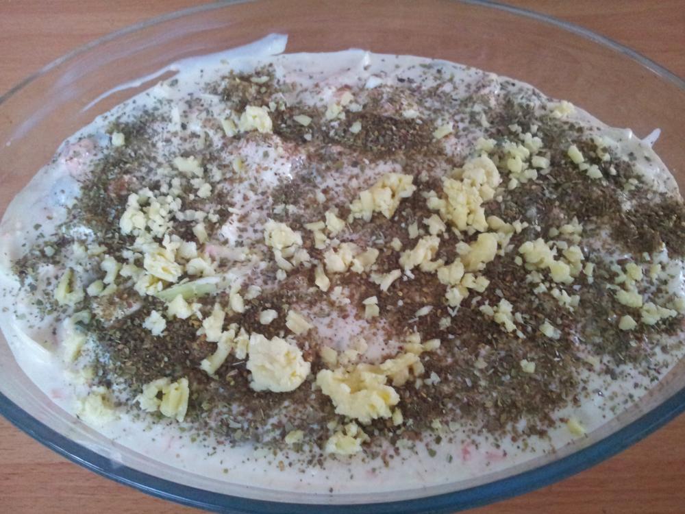 وأجيب صاج أقطع له بصله واشوحها مع صدور دجاج مقطعه وبهارات وملح وأضيف ملعقه زيت زيتون وملعقة خل وفلفل بار د واقلب واغطي الصاج الين تنضج صدور الدجاج المقطعه اسكبها للمكرونه وأضيف ملعقتين مايونيز او ثلاث للمكرونه واقلب واقربها مره لذيذه وإذا عندك كشنه مكرونه مفرزنه استخدميها