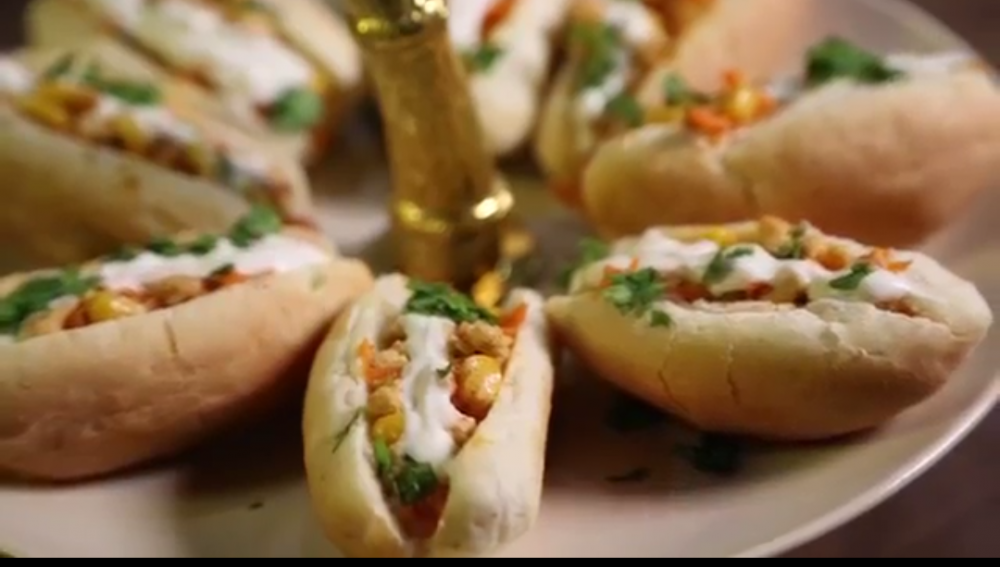 3- نفرغ حبات الخبز ونحشيها بالدجاج ونوزع عليها