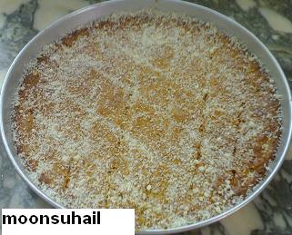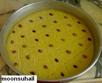 الطريقه تخلط كل المقادير مع بعض وتوضع في صينيه وتترك لمده نصف ساعه ترتاح ومن ثم تقطع وتزين بالفستق وتدخل الفرن الى ان تستوي وتخرج من الفرن ونرش عليها الشيره