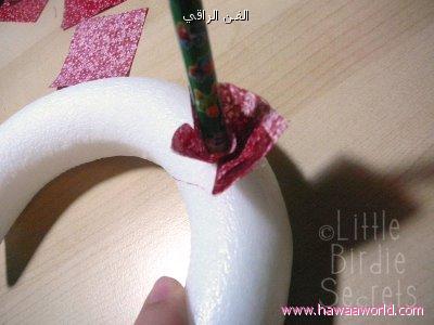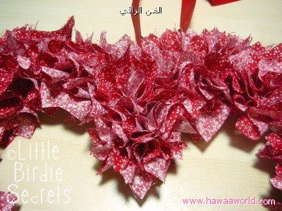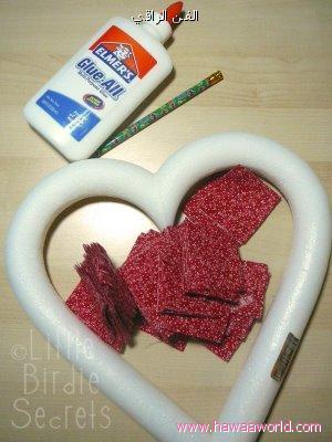 تعليقة جميلة على شكل قلب الأدوات المطلوبة قطع صغيرة من القماش على شكل مربع قلم رصاص ، غراء ، الستايروفوم القلب أو كرتونه نقضها على شكل قلب نضع قلم الرصاص في منتصف قطعة القماش ونضمها ونضع عليها قليل من الغراء كما في الصورة ونضعها على القلب ونضغط بقلم الرصاص نكمل بنفس الطريقة إلى ان نغطي القلب بقطع القماش الشكل النهائيتعليقة جميلة على شكل قلب الأدوات المطلوبة قطع صغيرة من القماش على شكل مربع قلم رصاص ،...