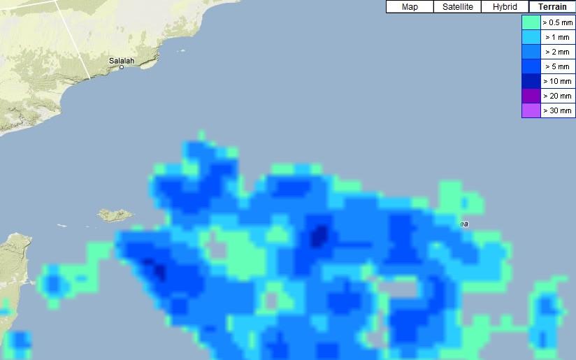 النشاط الركامي بقرب جزيرة سقطرة اليمنية الذي قصدته في ردي السابق والذي تدفقت بعض سحبه على صلالة يوم أمس لقربها النسبي منه ( الله يجعله أقرب وأقرب) .... كم هائل من الأمطار في بحر العرب... ونقول ياااااا رب اجعل لنا نصيب منها قبل الموسم واسقنا غيوث رحمة مباركة....