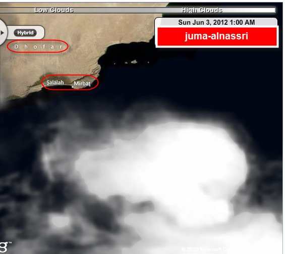 ليوم أمس الجمعة بتاريخ 1/6/2012م لجبل سمحان يحتضن السحب الداخلة للمحافظة...قادمة من النشاط الركامي في بحر العرب بالقرب من جزيرة سقطرة اليمنية...
