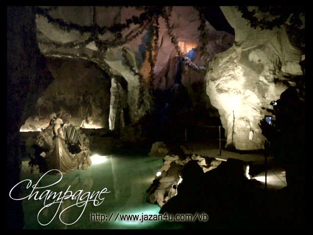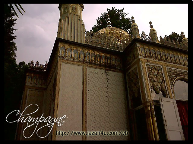 في داخله بحيرة و قارب على شكل قوقعه مذهبه يجلس فيها و