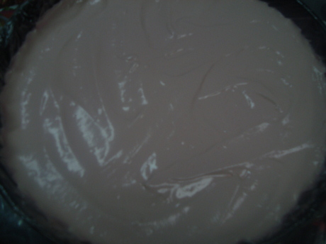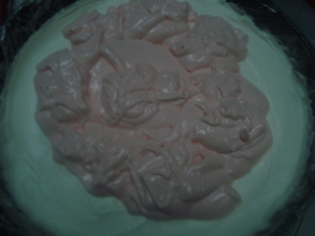 ثم ضعي م ك جلي فرواله واخلطيه حتى يتجانس ويصبح زهري ثم نضعه على طبقة الايس كريم