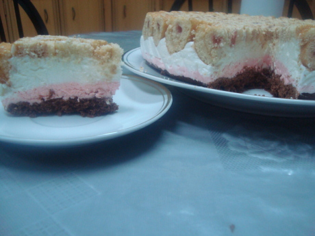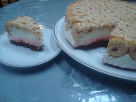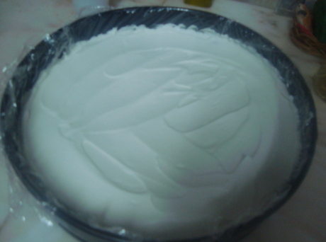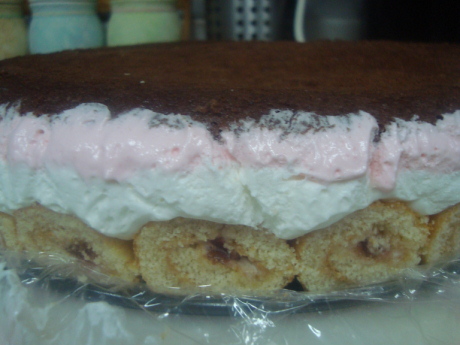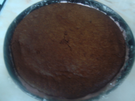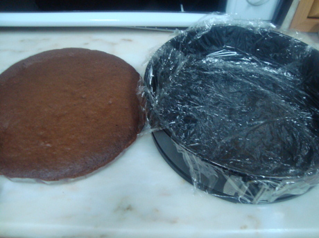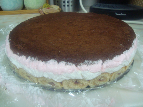 وندخلها الفريزر لمدة ساعه ثم نضع عليه طبقة الكيك الي عملناه وبحذر ونغطيها بالنايون كويس