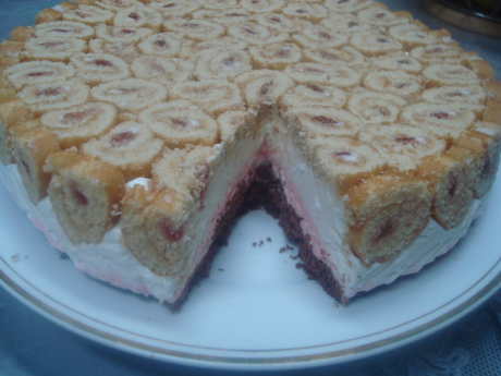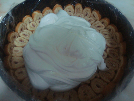 حتى يثقل الخليط ويتجانس ثم صبيه على السويس رول وساويه وضعيه في الفريزر ساعتين