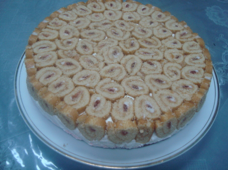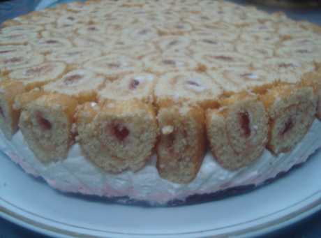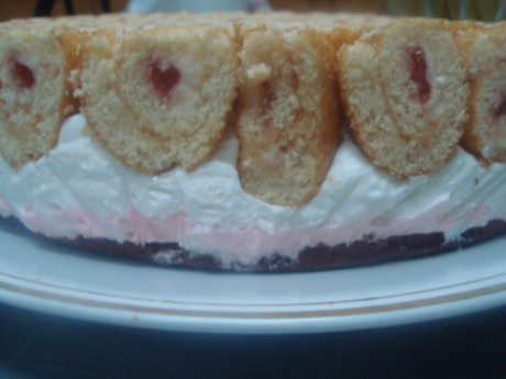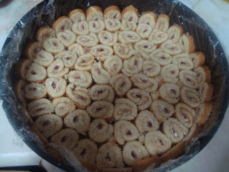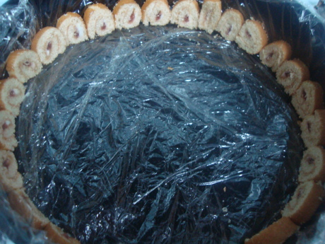 ونغلفها بالنايلون من جميع الجهات وناخذ كيك سويس رول بنكهة الفروالهاو اي نكهه ثم