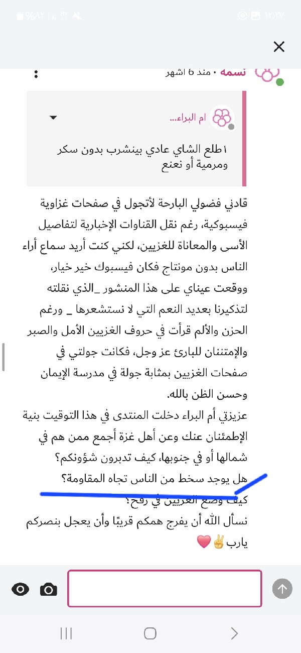 قرارات حماس بخوض المعارك والجهاد ضد المحتل سميتيها قرارات بالتصعيد والتوجه نحو العنف! والله كأني جالسة اسمع مبعوث الأمم المتحدة نفس طريقة اللعب بالألفاظ. الانفاق على التسلح هذا من قبيل اعداد العدة للجهاد لإرهاب العدو الي ربنا بنص القرءان الكريم أمر فيه عباده. وغضبك من المقاومة وسخطك عليهم بدافع مصلحة الفلسطينيين لم نراه من أهل غزة أنفسهم تدرين ليش؟ لأن فصائل المقاومة جزء لا يتجزأ من أبناء غزة وعناصر المقاومة مو مستوردين من خارج فلسطين لا هم أبناء غزة أنفسهم وهذا اقتباس لي من ردود بيني وبين العضوة أم البراء من مدينة غزة اكتفي به للرد على مزاعمك.قرارات حماس بخوض المعارك والجهاد ضد المحتل سميتيها قرارات بالتصعيد والتوجه نحو العنف! والله كأني...