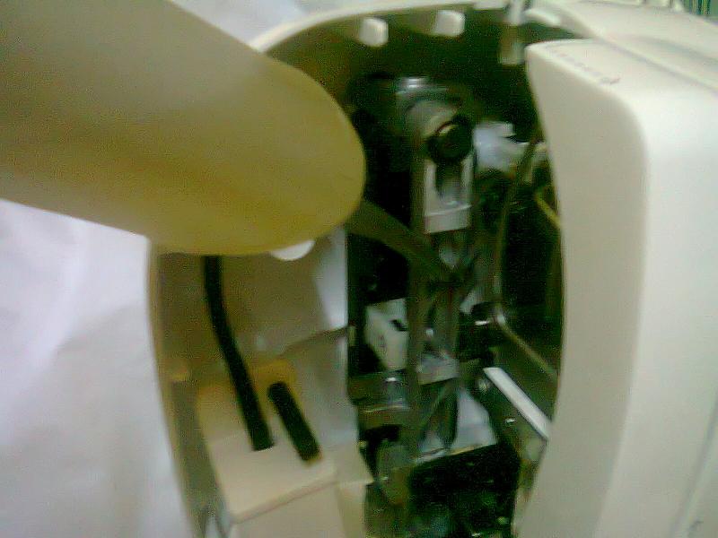 نمسحا من الخرج بقطعة قماش ولا ننسى تنظيف مكان سير الخيط و نضع قطعة قماش تحت الابرة علشان ما ينزل الزيت لبيت المكوك