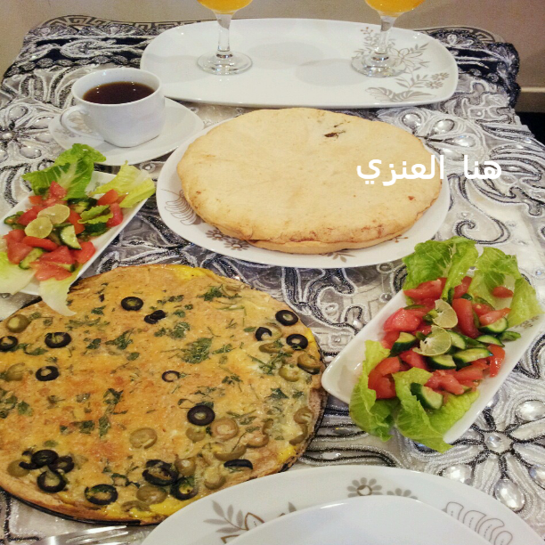 هنا بعد ماطلعتها من الفرن عملتها ع العشا مع بيتزا بالبيض