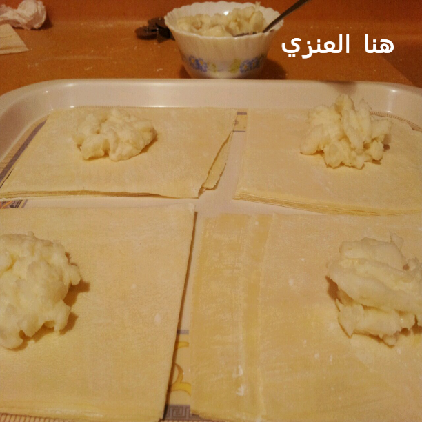 نقطع ورق الجلاش مربعات كبيرة شوية ونحط قشطة في النص