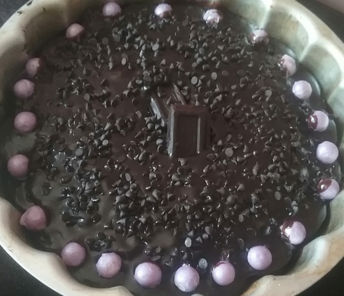 خرجي الكيكه وصبي عليها التشريبه نص كوب حليب مع نص ملعقه نسكافيه وخليها تبرد شويه وحطي صوص الشكلاته وزينيها بحبيبات الشوكلاته