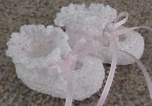 MATERIALS: Bernat Baby Coordinates Hook Size F 2-20" lengths of 1/8" picot edged ribbon (pink for Emma) Stitches: ch, sl st, sc, sc dec. Difficulty: EASY/MEDIUM -------------------------------------------------------------------------------- ** MAKE 2 ** SOLE R1: Ch6, sc in 2nd ch from hook and in ea rem ch. (5sc) R2: Ch1, turn. 2sc in same st. Sc in next 3 sts. 2sc in last st. (7sc) R3: Ch1, turn. Sc in ea st. (7sc) Rs4-11: Rep R3 R12: Ch1, turn. Sc dec over 2 sts. Sc in next 3 sts. Sc dec over last 2 sts. Edging: Ch1, turn. Sc in ea st and in each row end around entire piece. (36sc) Fasten off and mark as right side. HEEL R1: With RS facing, working in bl's only. Reattach yarn in the center stitch on RS of sole. (7 sts back from the original fasten off point) Sc around to same point on opposite side. (19sc) R2: Ch1, turn. Sc in ea st. Rs3-4: Rep R2. R5: Ch1, turn. Sc in 1st st. (Ch1, sk next sc, sc in next sc) around. R6: Ch1, turn. Sc in ea sc and ch1 sp. R7: (Ch3, sc in next st) around. TOE R1: With left side of bootie facing you, reattach yarn in the BL only of the first unworked st on the sole edging. Ch1, sc in BL of ea st around. R2: Ch1, turn. Sc in ea st. R3: Ch1, turn. (Sc in same st. Sc dec over 2sts) across. R4: Rep R3. R5: Ch4, turn. Sl st in same st. Ch3. Sl st in st on other end of same round. (this forms a little hole on the top of the toe). Ch4, sl st in the same st. Fasten Off. FINISHING Weave ribbon through the holes on R5 of Heel, bring each end of the ribbon through the ch4 loop on each side of the toe, draw up and tie in a bowMATERIALS: Bernat Baby Coordinates Hook Size F 2-20" lengths of 1/8" picot edged ribbon...
