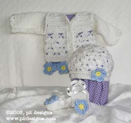 Crochet Hooks: 4 mm and 5 mm . Yarn needle, 2 snap sets each for bib and shoes, ribbon rose for bib, sewing needle and thread.
